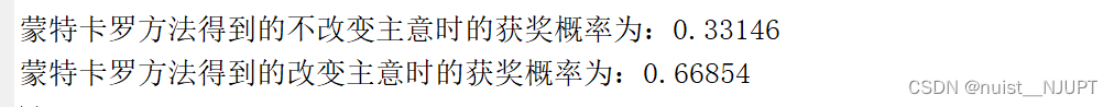 disp(['蒙特卡罗方法得到的不改变主意时的获奖概率为:', num2str(a/n)]);
