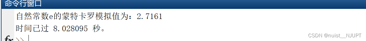 disp(['自然常数e的蒙特卡罗模拟值为:', num2str(1 / frequency)]) % 注:自然常数真实值约为2.7182