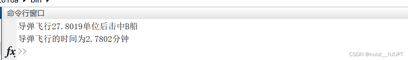 disp(['导弹飞行',num2str(d),'个单位后击中B船'])