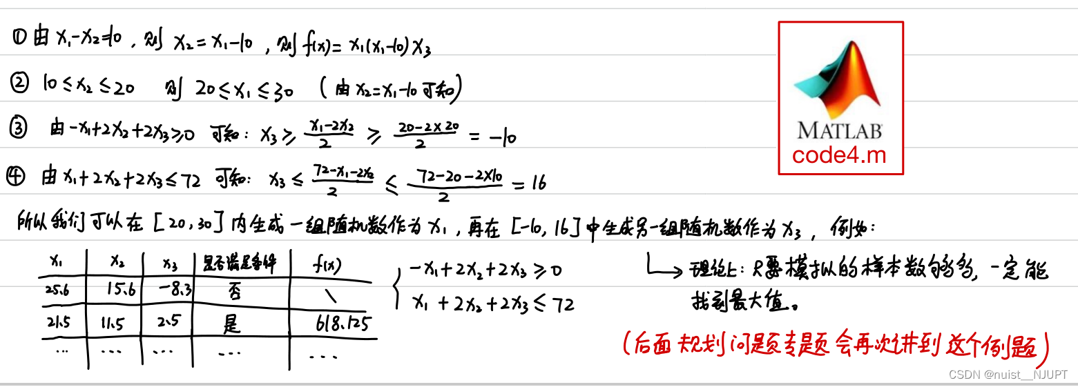 我们看一下这个非线性规划问题,这个问题看起来不是很复杂,我们使用蒙特卡洛模拟,给出决策变量的大概范围,在范围生成数据进行模拟,满足约束的即为可行解,我们讲可行解代入目标函数,通过大量的模拟,找到一个可行解代入目标函数得到最小值,即为近似可行解。