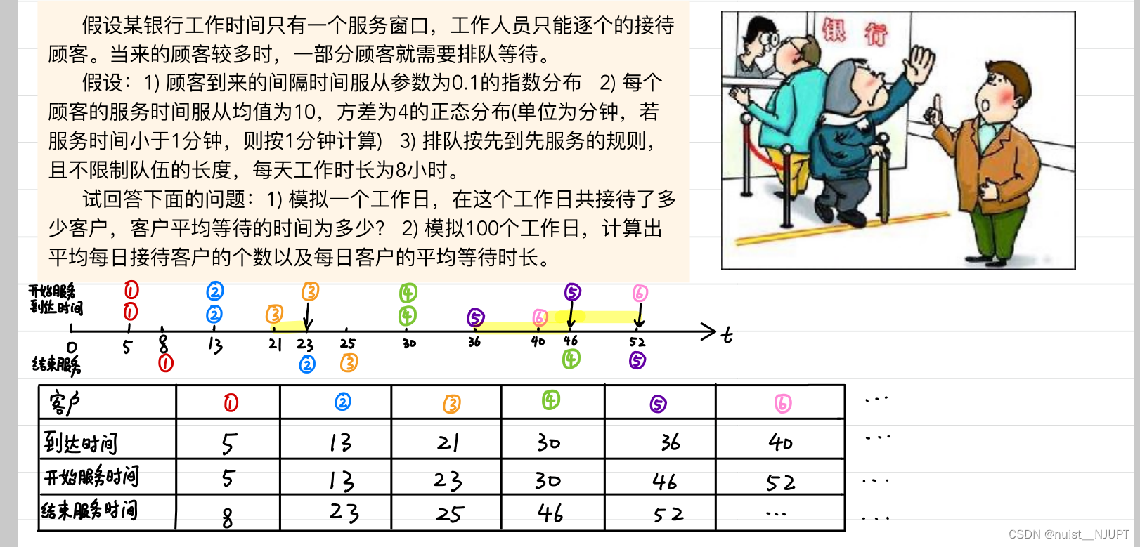 我们先看一下题目,排队论问题就是先到先服务原则,一个先到先服务的串行过程,每个顾客能否服务取决于上一个顾客是否服务结束,我们通过模拟用户到来的时间间隔和每个顾客服务的时间间隔可以求出客户的平均等待时间。