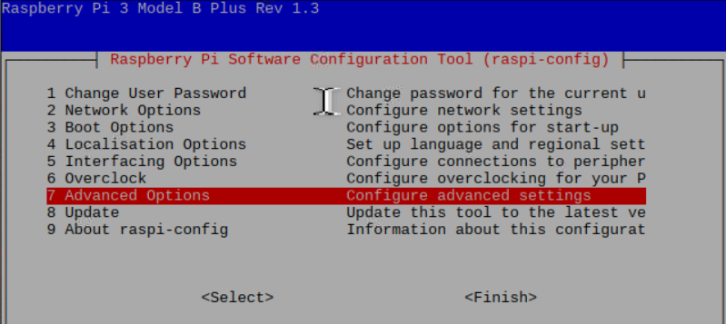 sudo raspi-config2.出现如下界面,选择第七项Advance: