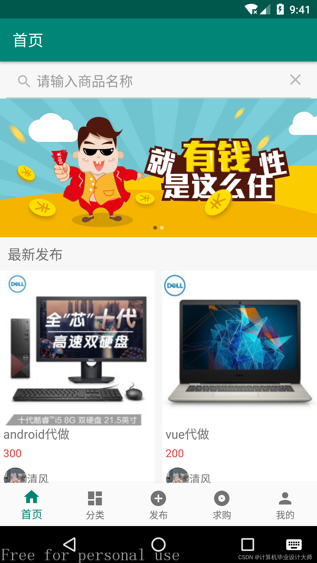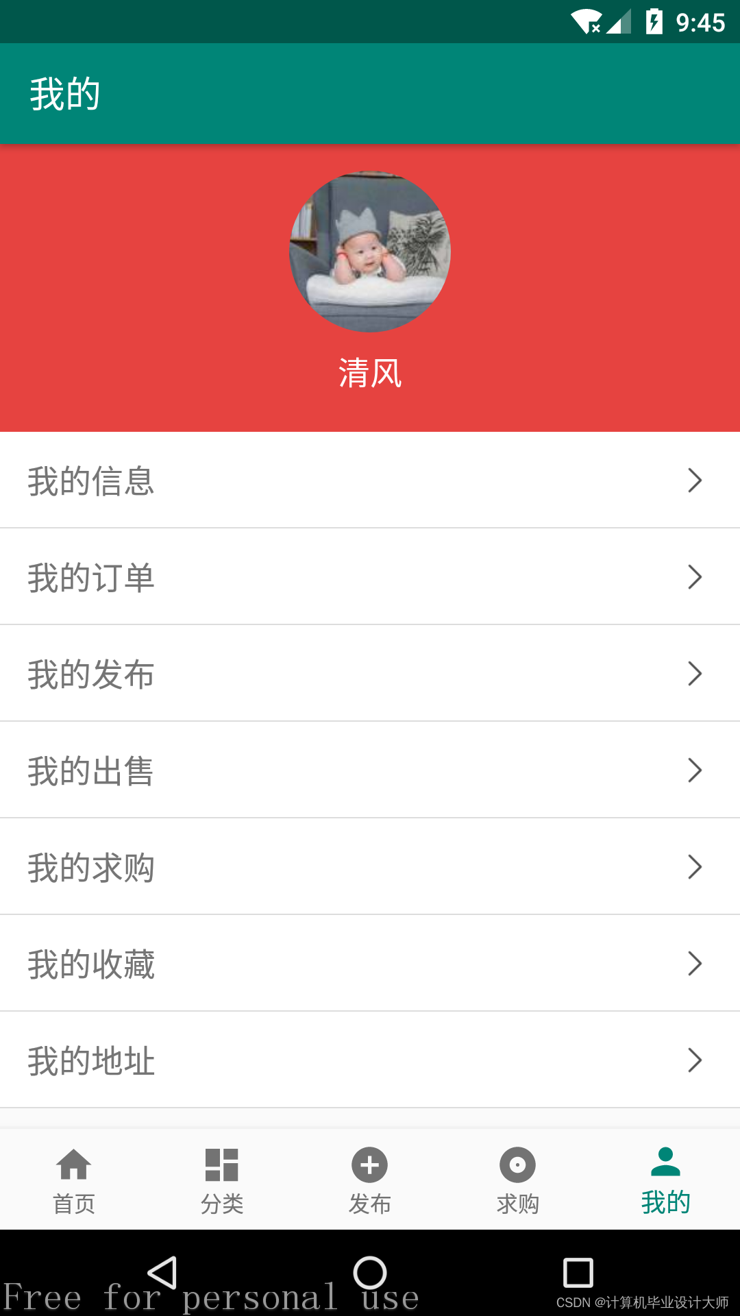 个人中心显示我的信息(可编辑),我的发布(可删除),我的订单(包含取消,支付),我的出售(出售订单),我的求购,我的收藏,我的地址(可增删改)