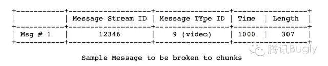 首先包含第一个Message的chunk的Chunk Type为0,因为它没有前面可参考的chunk,timestamp为1000。type为0的header占用11个字节,假定CSID为3<127,因此Basic Header占用1个字节,再加上Data的32个字节,因此第一个chunk共44=11+1+32个字节。
