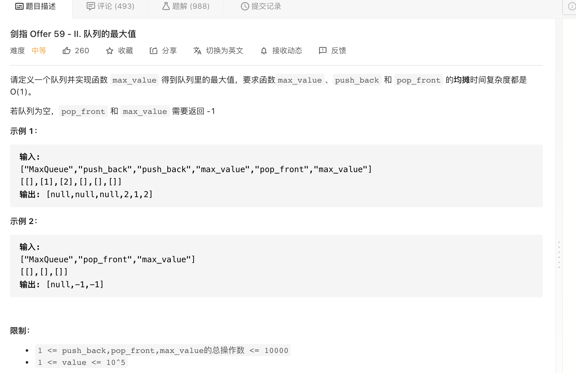 此题比较经典,主要考察队列的使用,首先构造一个递减序列,那么只要序列前面的值没有被窗口丢弃,就一直是最大值,依照这个思路,放置下标更容易一些。每次构造后都必须判断是否队头已经过期。边界的问题比较难搞。