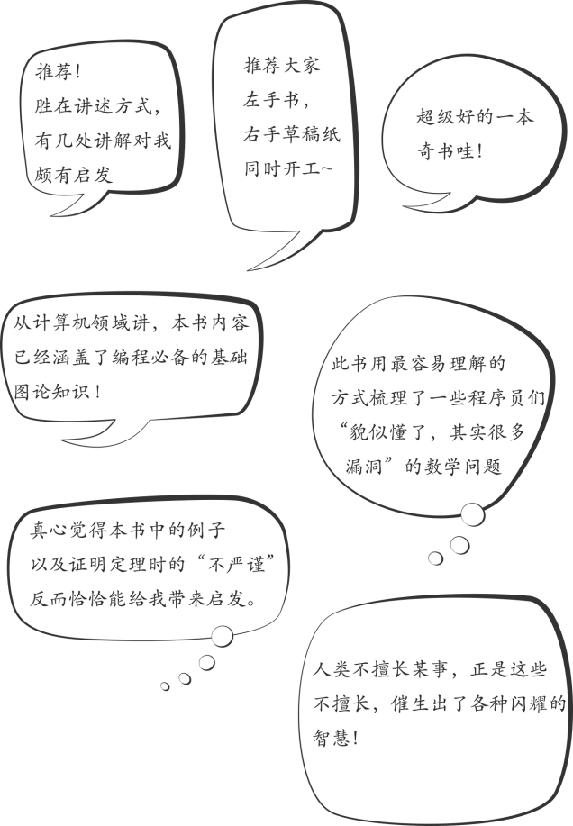 比如为了确保内容通俗易懂,这本书在介绍某些定理时,舍弃了不好理解的一般性证明,用了很多例子来进行说明。同样,在描述算法时,为了确保正确性,按道理应该给出伪代码,但本书还是用具体的例子对算法的运行过程进行了说明。