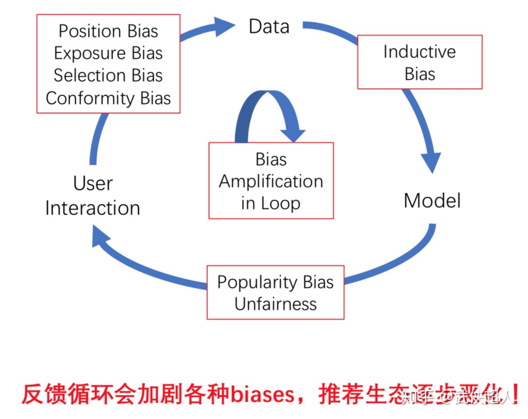 这些bias在推荐系统的反馈循环中会不断被加剧,导致推荐生态逐步恶化
