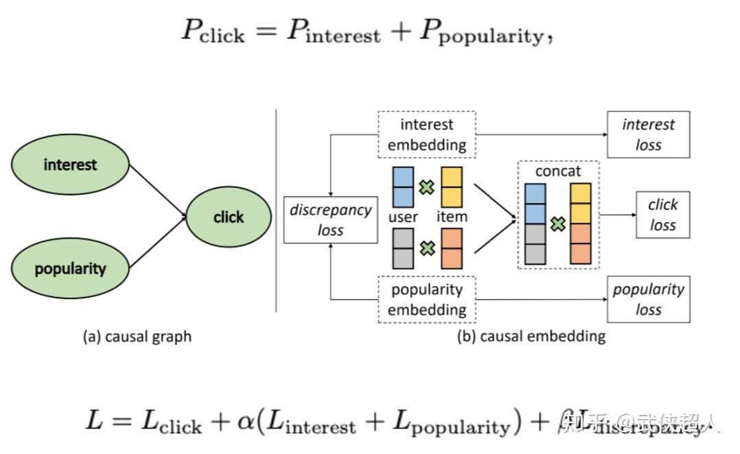 因果图或因果推断方法:常用在处理反事实推论上面,2020年arxiv上有篇文章是典型的这个思路,假设用户点击取决于个人兴趣和群体观念,设计了interest embedding捕获用户真实兴趣,popularity embedding捕获因流行度带来的伪兴趣,最终采用interestembedding进行预测