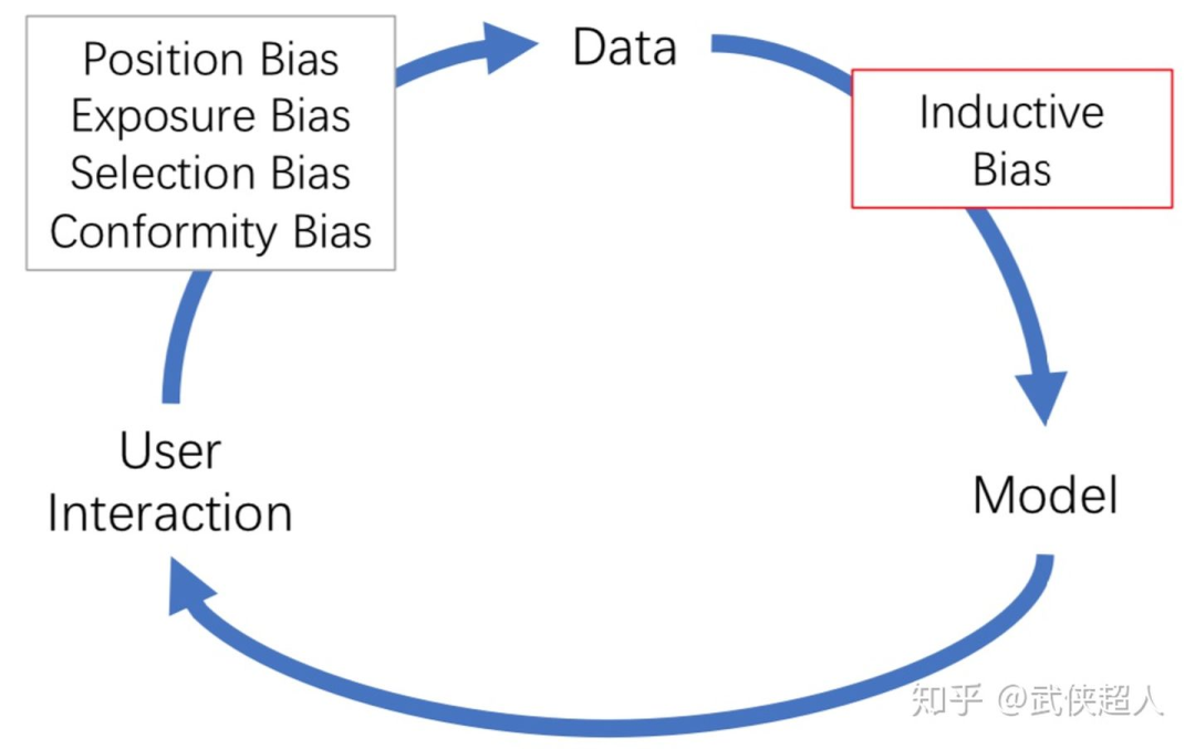 从user、data、model这三个推荐循环生态的角度出发,整体归纳起来大致有以下几个Bias(其实这些Bias很多场景下是可以互相转化的)。