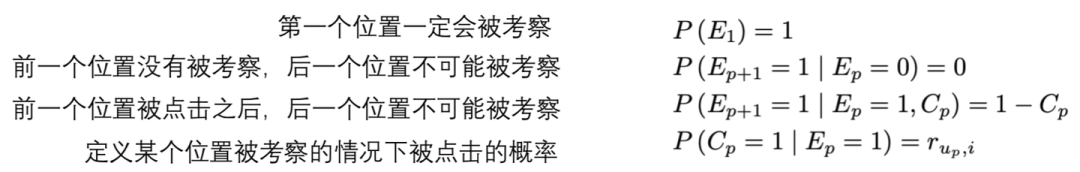 cascade模型假设:用户从第一个到最后一个依次考察,点击一旦发生,序列行为便会停止,有些论文提出了一些公式来表示这个假设