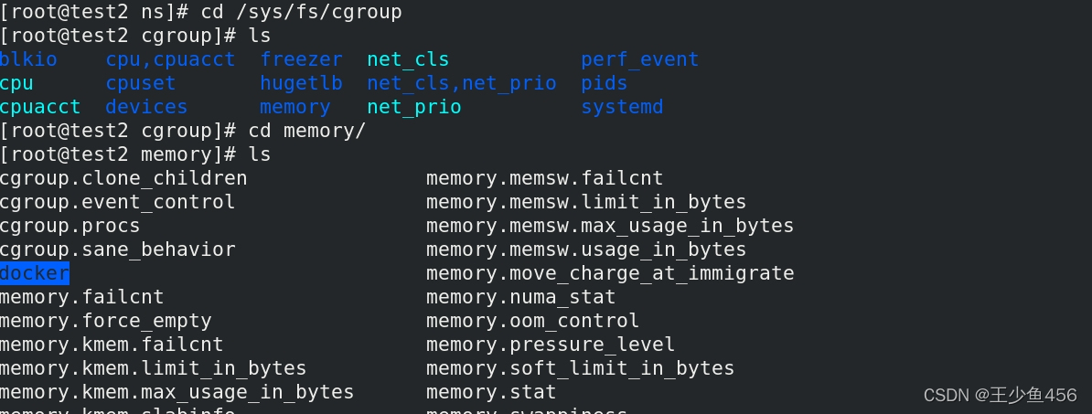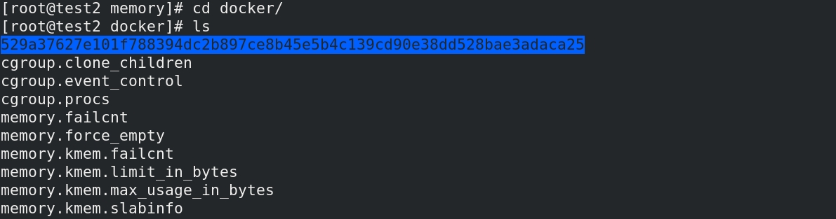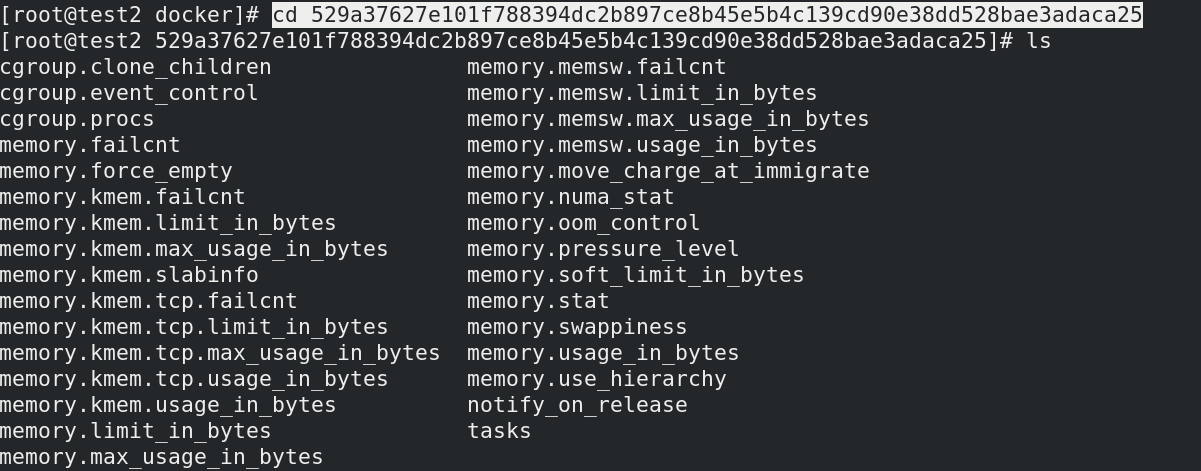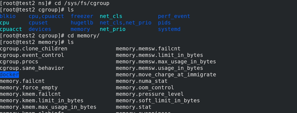 在/sys/fs/cgroup中有许多的子目录,分别控制每个资源,我们进入到memory文件夹下,看到docker目录