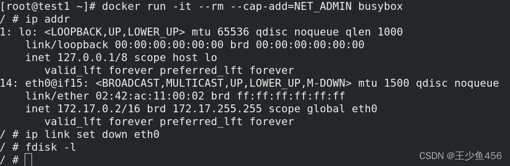 如图,--cap-add=NET_ADMIN表示将网络操作的权限放入白名单,用户只可以进行网络操作