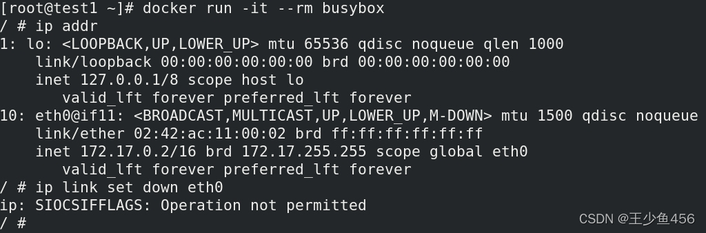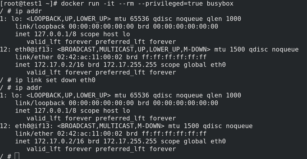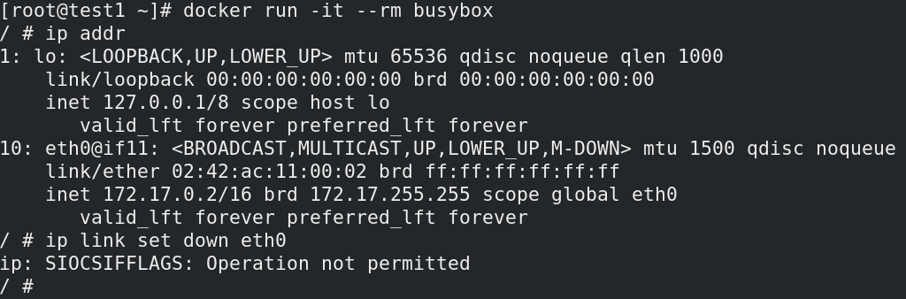 (1)运行一个容器,尝试关闭其eth0接口,显示操作不被允许