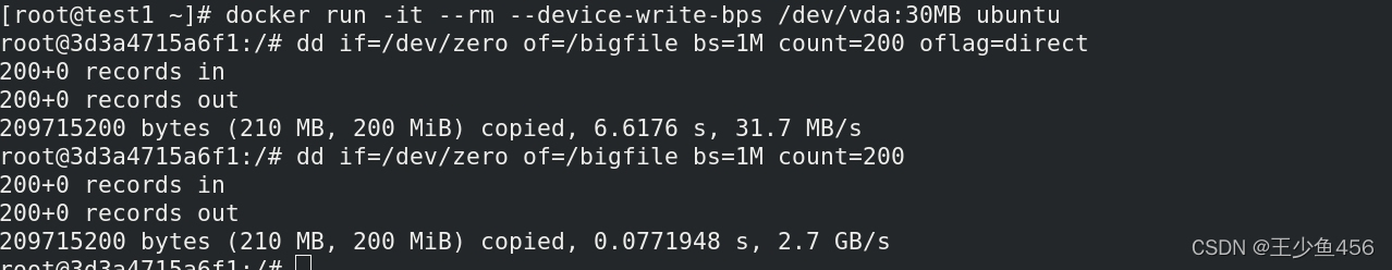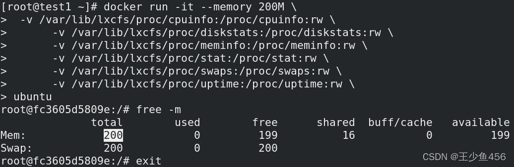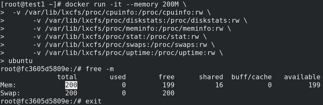 docker run -it --memory 200M --memory-swap=200M ubuntu--memory设置内存使用限额