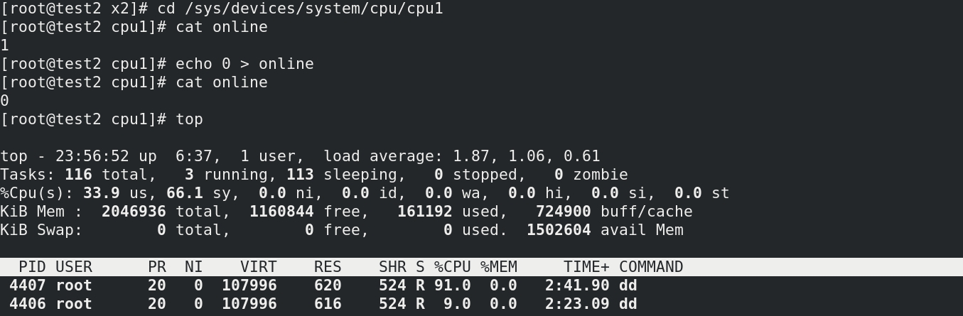 发现还是100%使用cpu,这是因为虚拟机有两个cpu,目前还没有发生资源争抢,关闭cpu1(注意cpu0是无法关闭的)