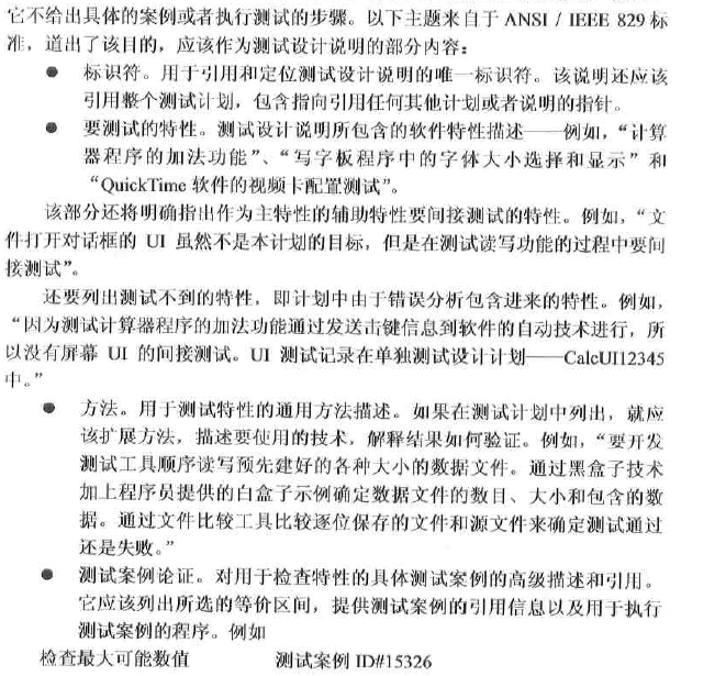 为单个软件特性定义测试方法的下一级细节是测试设计说明。测试说明的目的是组织和描述针对具体特性需要进行的测试。然而,它不给出具体的测试案例或者执行测试的步骤。