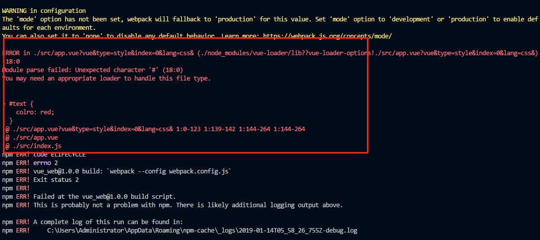 E:\vue实战\vue_web>npm run build> vue_web@1.0.0 build E:\vue实战\vue_web> webpack --config webpack.config.jsHash: 057884840cecb3060636Version: webpack 4.28.4Time: 5481msBuilt at: 2019-01-14 13:31:111 assetEntrypoint main = bundle.js[0] (webpack)/buildin/global.js 472 bytes {0} [built][1] ./src/app.vue 184 bytes {0} [built] [failed] [1 error][3] ./src/index.js 233 bytes {0} [built]+ 4 hidden modulesWARNING in configurationThe 'mode' option has not been set, webpack will fallback to 'production' for this value. Set 'mode' option to 'development' or 'production' to enable defaults for each environment.You can also set it to 'none' to disable any default behavior. Learn more: https://webpack.js.org/concepts/mode/ERROR in ./src/app.vue 1:0Module parse failed: Unexpected token (1:0)You may need an appropriate loader to handle this file type.> <template>| <div id="text">| {{text}}@ ./src/index.js 3:0-28 10:19-22npm ERR! code ELIFECYCLEnpm ERR! errno 2npm ERR! vue_web@1.0.0 build: `webpack --config webpack.config.js`npm ERR! Exit status 2npm ERR!npm ERR! Failed at the vue_web@1.0.0 build script.npm ERR! This is probably not a problem with npm. There is likely additional logging output above.npm ERR! A complete log of this run can be found in:npm ERR! C:\Users\Administrator\AppData\Roaming\npm-cache\_logs\2019-01-14T05_31_12_291Z-debug.logE:\vue实战\vue_web>