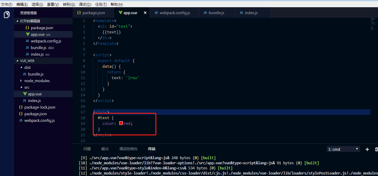 <template><div id="text">{{text}}</div></template><script>export default {data() {return {text: 'lrxu'}}}</script><style>#text {color: red;}</style>