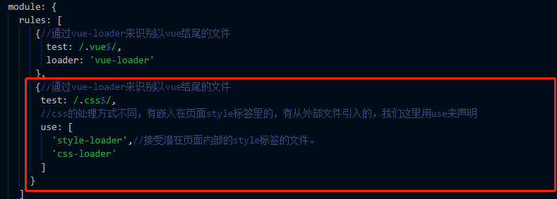 这里用了use属性而不是loader属性,是因为我们处理css文件的方式有多种,所以这里出多种方式的css加载需要用到use属性,所以这里用到了use,style-loader也就是处理html文件内部的style标签内的css样式,也就是我们俗称的内联,css-loader处理的是从文件外部引入的css文件,这里大家简单了解一下。