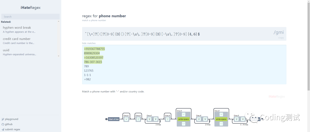 i Hate Regex首页展示规则有:username、phone number、email、date、ascii、password、ip address、ipv6、ssn等也可以自定义搜索正则规则。在线实时查看方便好用!