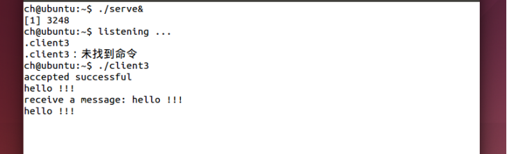 当运行服务器代码后出现listening ,接着运行客户端代码,发现连接成功,输入hello !!!后服务器输出收到的信息,再把收到的信息写到套接字里发回给客户端,所以看到了三个hello !!!。