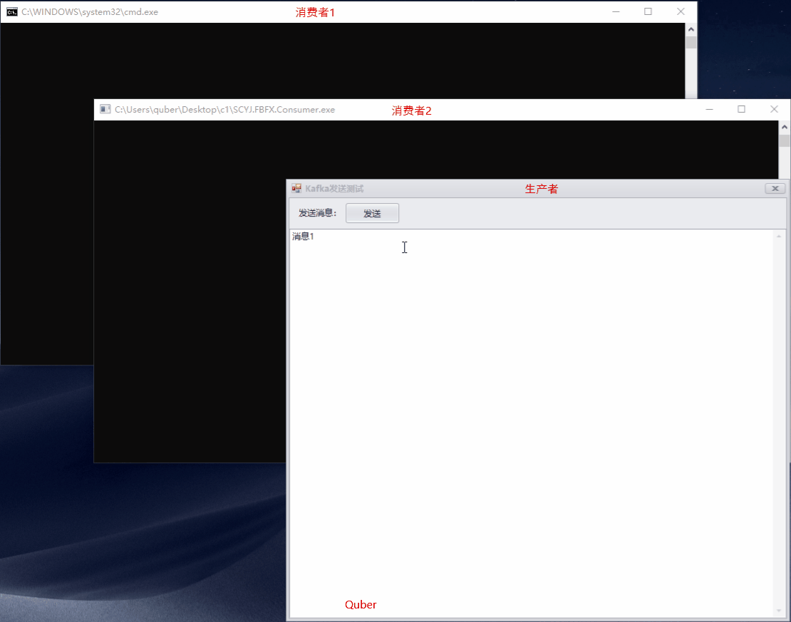 这里需要注意的是,此处的2个消费者账号quber1和quber2在消费主题TestTopic时,他们所在的分组一定要不一样,否则后启动的消费者将无法消费信息,这一点在之前的文章“Kafka配置2--Windows下配置Kafka的SASL-PLAIN身份验证”中也提到过,需要特别注意。