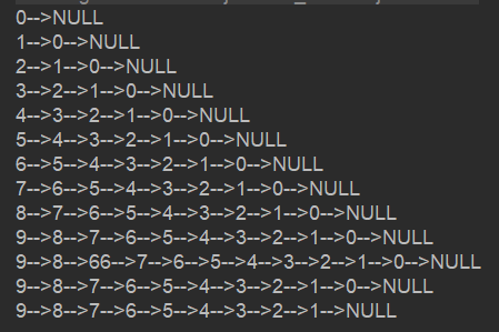 public class Main { public static void main(String[] args) { LinkedList<Integer> linkedList = new LinkedList<Integer>(); for (int i = 0; i < 10; i++) { linkedList.addFirst(i); System.out.println(linkedList); } linkedList.add(2, 66); System.out.println(linkedList); linkedList.remove(2); System.out.println(linkedList); linkedList.removeLast(); System.out.println(linkedList); } }
