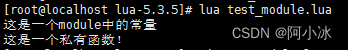 [root@localhost lua-5.3.5]# vi test_module.lua --调用某一个模块,使用引号来引用模块名即可 require("module") --调用某个模块下的常量 print(module.constant) --调用某个模块下的函数 module.func3()我们调用10.1.1中的变量和方法,效果如图: