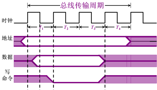 主模块发出写命令,从模块接收到命令后,必须在规定时间内将数据总线上的数据写到地址总线所指明的单元中。