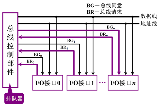 总线判优控制可分集中式和分布式两种,常见的集中控制优先权仲裁方式有三种:链式查询方式、计数器定时查询、独立请求方式。以下为______总线判优方式的接线图: