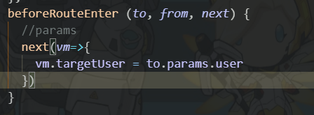 //这里值用:加参数的写法,user即为参数,注意一定要用/隔开在你的组件中,通过点击传递参数,targetUser传的参数