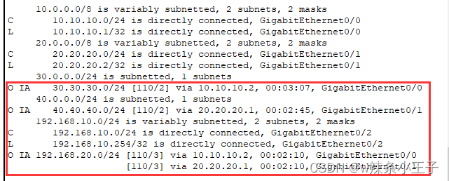 Router(config-router)#network 192.168.20.0 0.0.0.255 area 1查看R0路由表