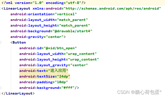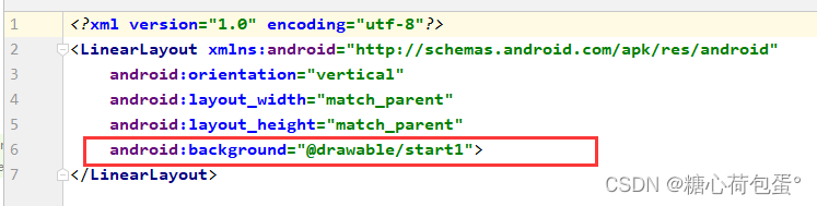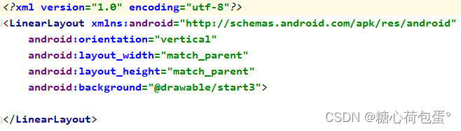 每个xml文件,只需要添加下面一行代码,该行代码是为该页面添加背景图片,每个xml文件的图片不同。(将图片放在drawable文件夹下面,这里就可以调用)。具体代码如下: