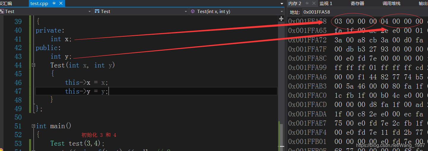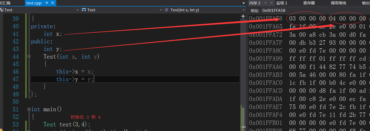 cout << sizeof(test) <<endl; // 8结果是8,说明成员x和y都占用后,其字节大小之和也是8,该有的空间都有,下面来观察下内存分布