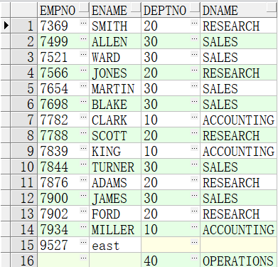 上图为执行之后的结果 由表格可知 第十五条数据 的e.deptno 为空不符合 连接条件 但还是显示出来了