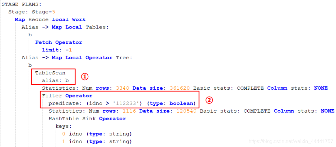 图中标 ① 处是表扫描操作,注意先扫描的 b 表,也就是 left join 后面的表,然后进行过滤操作(图中标 ② 处),我们 sql 语句中是对 a 表进行的过滤,但是 Hive 也会自动对 b 表进行相同的过滤操作,这样可以减少关联的数据量。