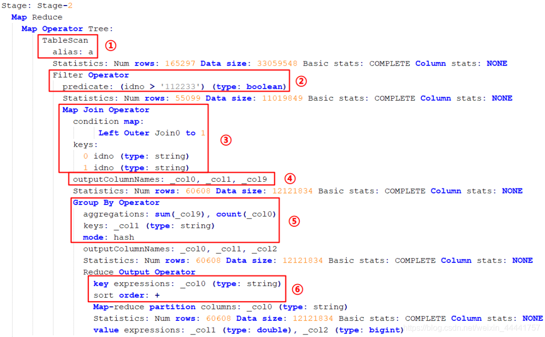 先扫描 a 表(图中标 ① 处);接下来进行过滤操作 idno > '112233'(图中标 ② 处);然后进行 left join,关联的 key 是 idno(图中标 ③ 处);执行完关联操作之后会进行输出操作,输出的是三个字段,包括 select 的两个字段加 group by 的一个字段(图中标 ④ 处);然后进行 group by 操作,分组方式是 hash(图中标 ⑤ 处);然后进行排序操作,按照 idno 进行正向排序(图中标 ⑥ 处)。