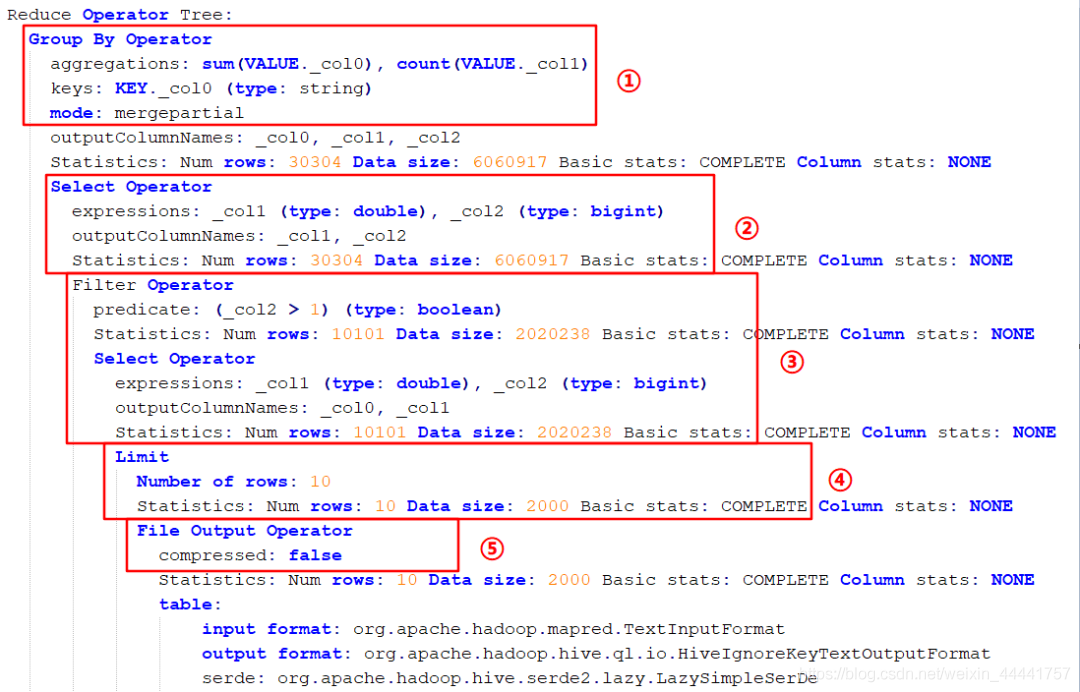 首先进行 group by 操作,注意此时的分组方式是 mergepartial 合并分组(图中标 ① 处);然后进行 select 操作,此时输出的字段只有两个了,输出的行数是 30304 行(图中标 ② 处);接下来执行 having 的过滤操作,过滤出 count_user>1 的字段,输出的行数是 10101 行(图中标 ③ 处);然后进行 limit 限制输出的行数(图中标 ④ 处);图中标 ⑤ 处表示是否对文件压缩,false 不压缩。