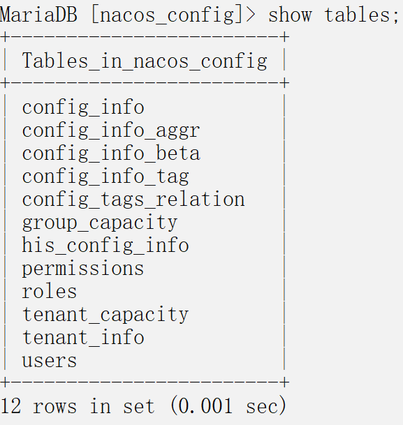 执行成功以后,会创建一个nacos_config数据库,打开数据库会看到一些表,例如;