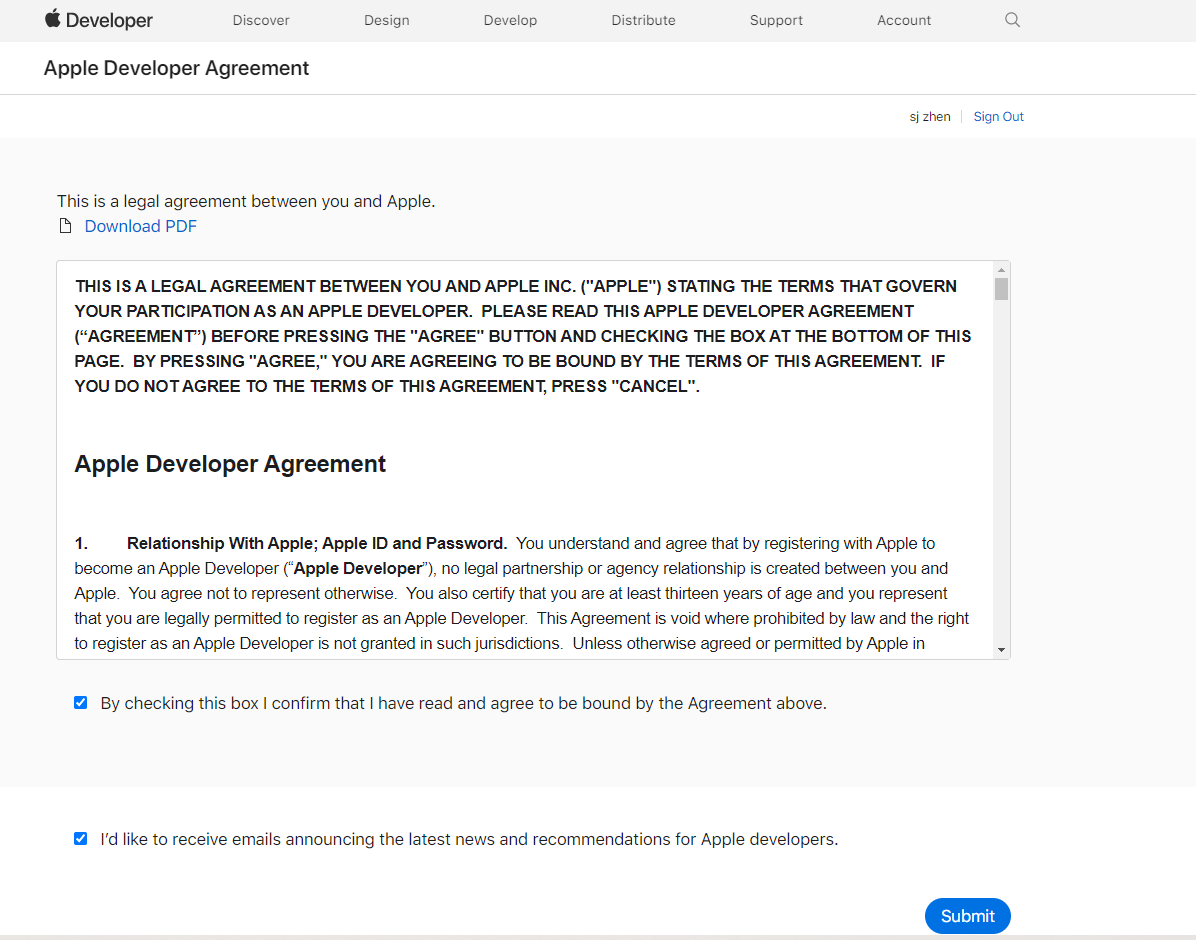 - 同意 Apple Developer Program 许可协议 (英文)。