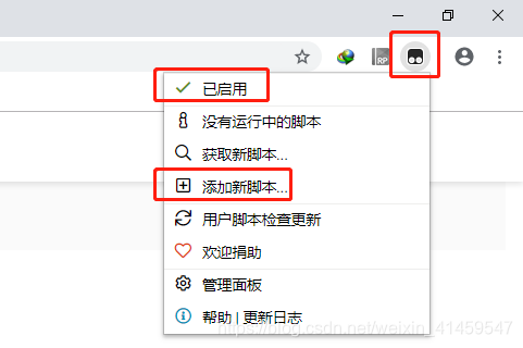 ④添加完成后,在Chrome浏览器的右上方有下图所示按钮,点击之后,选择添加新脚本