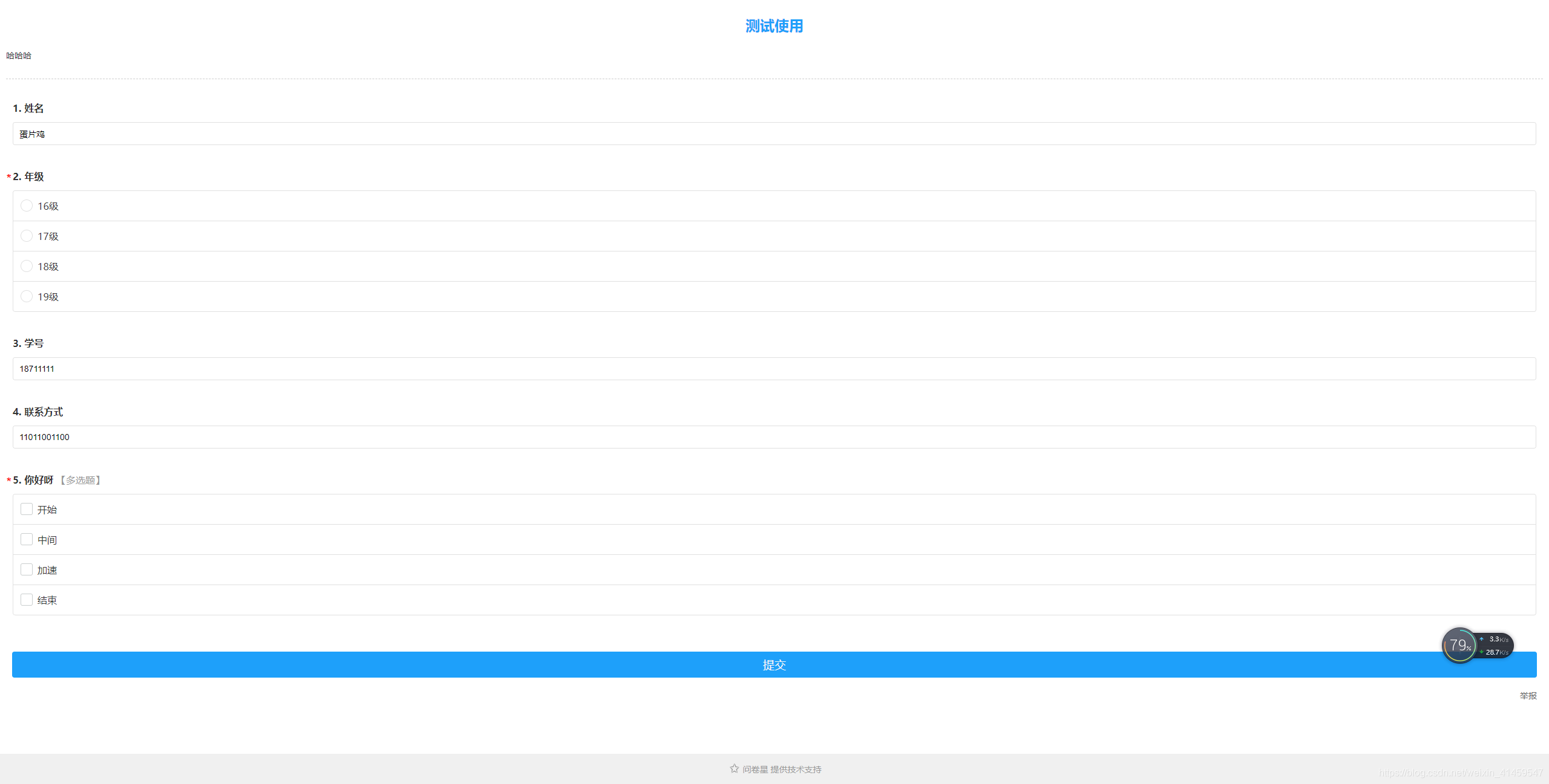 a、因为本人对js不太熟悉,所以有个问题要说明。当我们刷新页面的时候,发现填空题填写了,但是单选和多选是没有选上的,其实在js脚本里面,代码里是已经选上对应的选项了的,只不过不知道样式怎么不显示。(可以通过创建和我一样问题的问卷,然后做一下这份问卷,再提交问卷,最后到问卷后台查看提交的记录中是否有单选和多选记录即可)