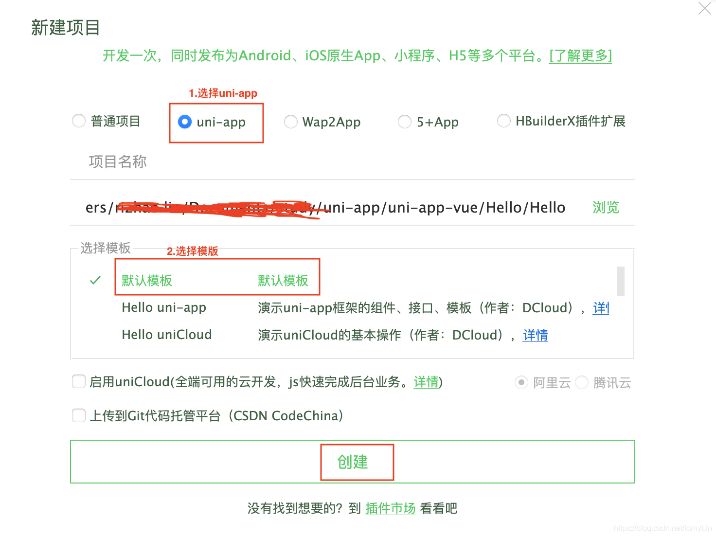 - 打开HBuilderX,文件->新建->项目,项目信息如下: