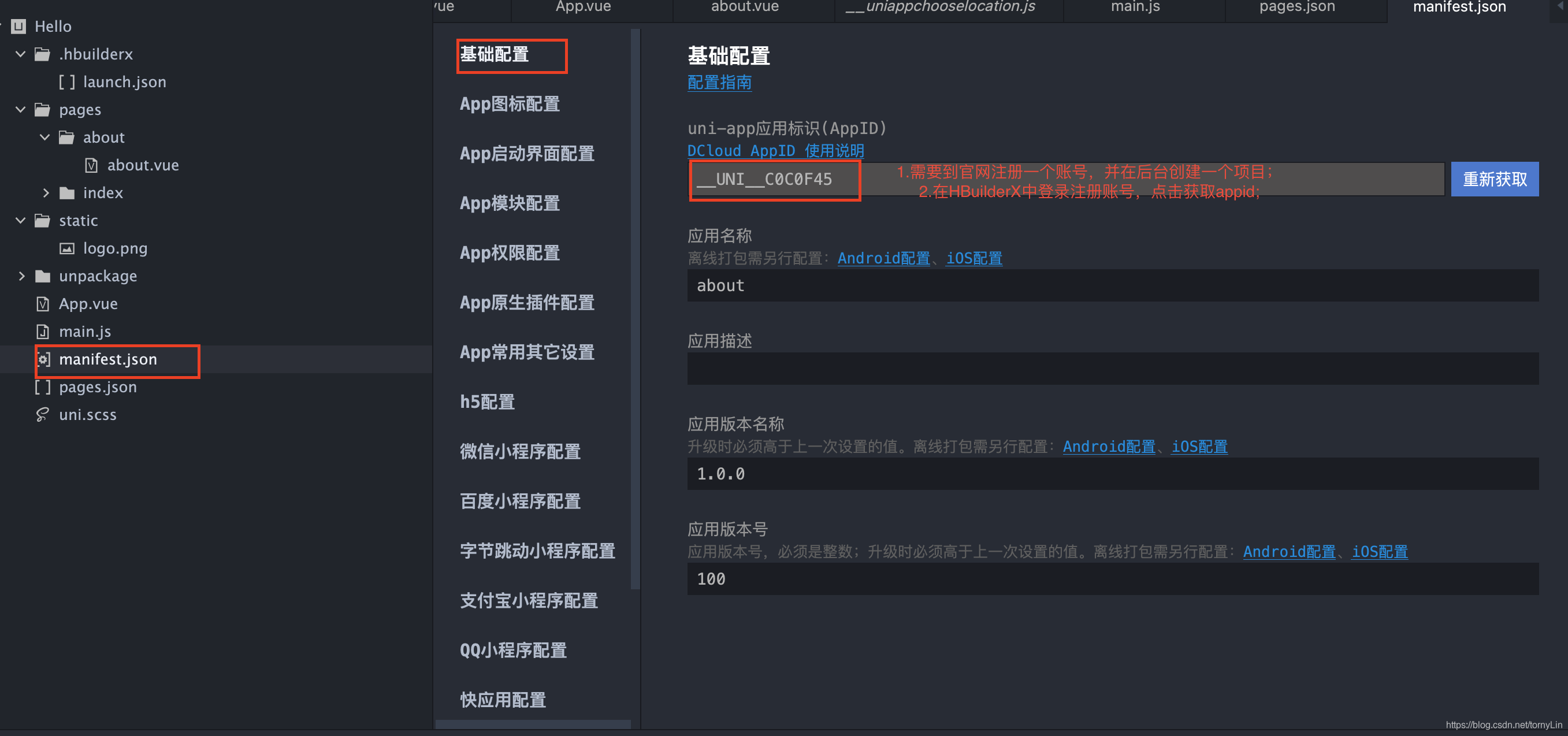 2)manifest.json:小程序的配置文件,选择性配置一些信息,如下图所示。前提:你需要到dcloud开发者中心官网注册一个账号,注册地址。在后台创建一个应用,如下图所示。