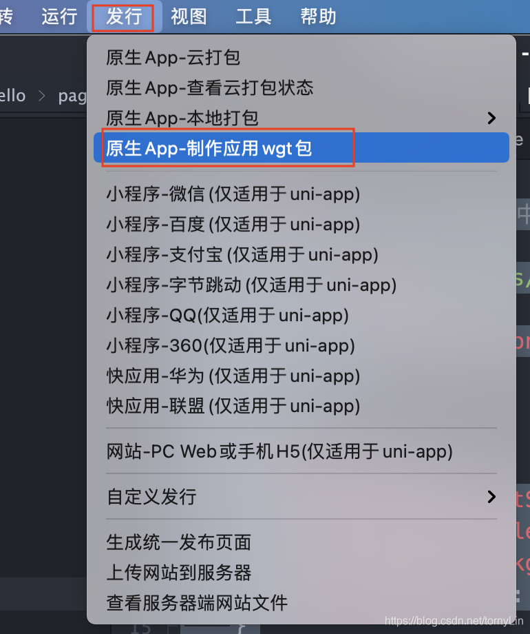 - 代码运行没有问题,就可以打包了。打开HBuilderX,点击左上角的发行按钮,生成wgt包 。
