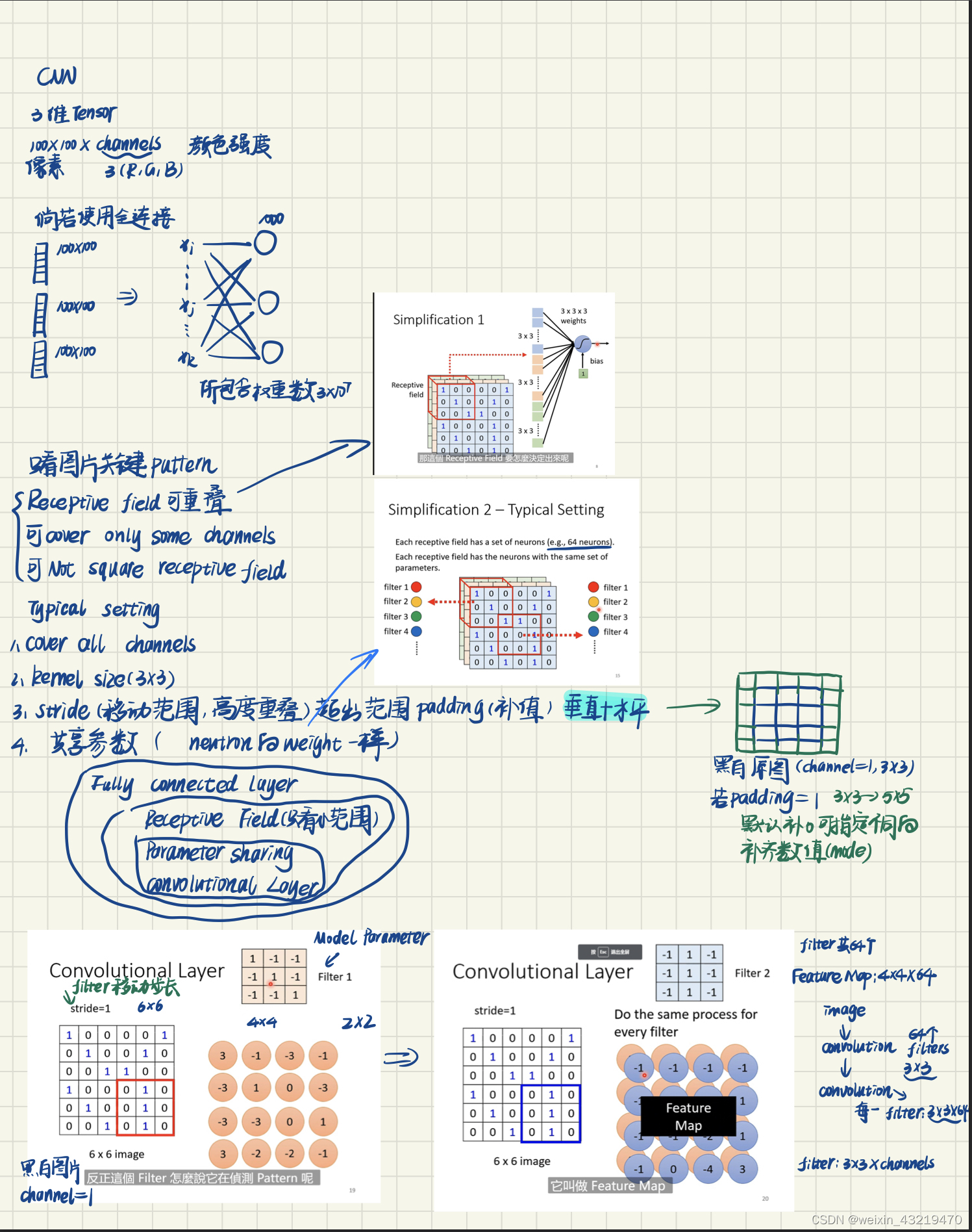 图片包括三个维度,channels(RGB),像素点个数(128*128等),倘若仅使用全连接网络,则模型所包括的参数量会很大,考虑到人眼分辨图片仅需一些关键特征即可做出判断,因此产生了CNN。