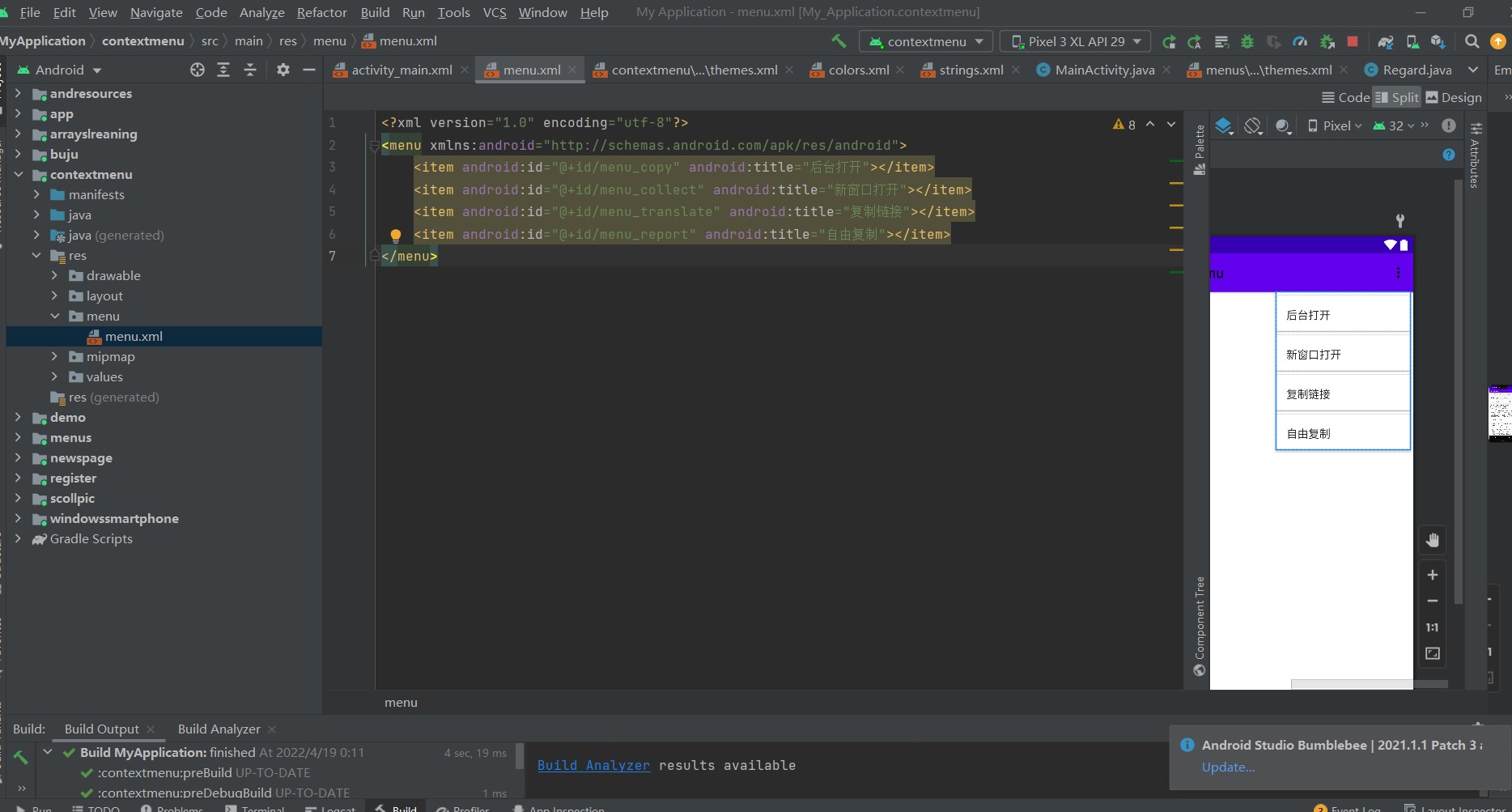 然后在新建的menu文件目录中新建menu.xml文件用来设置菜单选项具体内容的