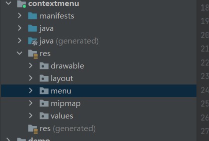 在安卓中对于菜单资源文件通常识放在/res/menu当中,而在资源文件夹res中,这个menu文件我我们需要自己创建。