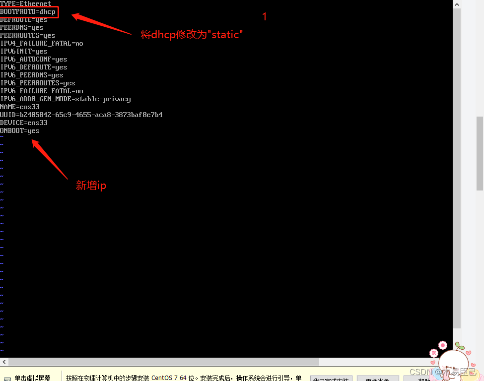 vi /etc/sysconfig/network-scripts/ifcfg-ens33BOOTPROTO="static" #设置为静态,让ip不变