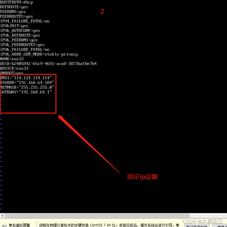 IPADDR="192.168.64.184" #自己想固定的ip 192.168.*.* 看自己主机的网段,如果是192.168.1.*或者是192.168.0.*,按对应设置,不然网络会不通